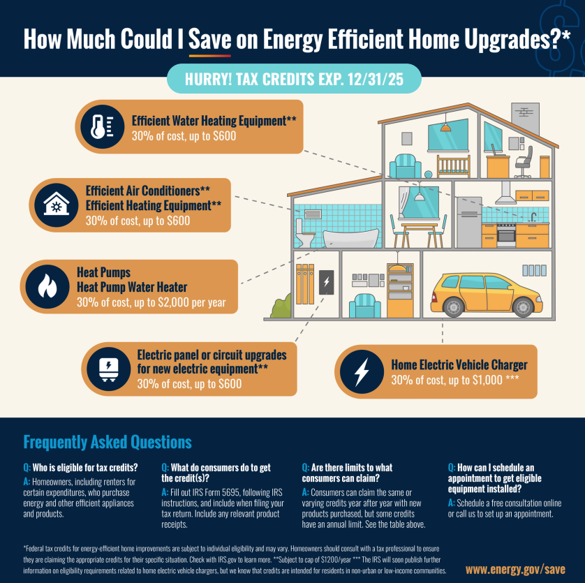 A: Currently, the credits for HVAC, water heaters, and electrical panels are set to expire at the end of 2025. It’s best to act now to be certain you’ll receive them.